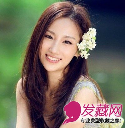 像花仙子般秀气的女生,一个甜甜的招牌笑容,清爽无累赘的长直发,中分的刘海气质且具修颜功效,花朵发饰的点缀,非常的美丽动人,额头高的妹子不妨一试啦!