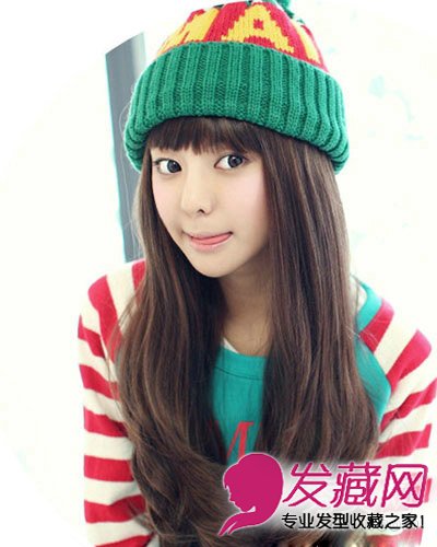 style8:齐刘海,长长的微卷发,清纯美眉的首选,搭配色彩鲜明的针织帽,好卡哇伊!