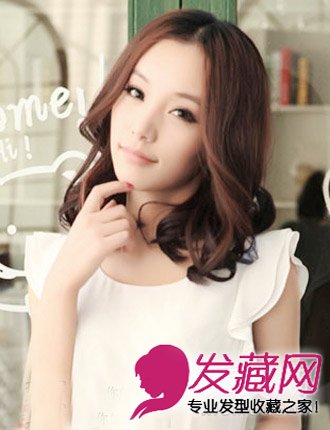 棕色的头发,做成卷发发型,还是非常流行的,时尚更显优雅气质,外卷个性的发尾,搭在肩头,灵动极了,中分的设计,加上王字脸,会显得MM脸更长哦。