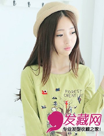 这款披散的层次发型,中分的造型设计,搭配娇小可人的锥子脸,小清新的感觉瞬间让人眼前一亮,搭配时尚的帽子,突显小女人的甜美可人。