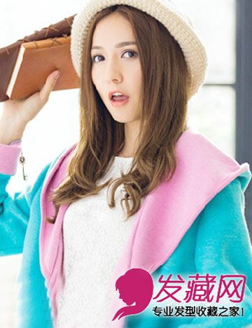 ,在发尾处做成微卷发的发型,清雅脱俗,给人时尚但不俗气的感觉,打理成中分的造型,搭配帽子,清新又甜美。