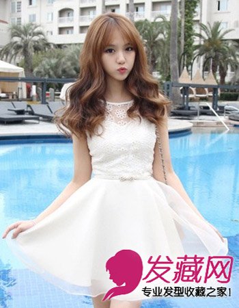如果妹纸们实在是想剪一款刘海发型的话,那小编建议妹纸们看看这款空气感刘海式的长卷发发型,配合棕色的