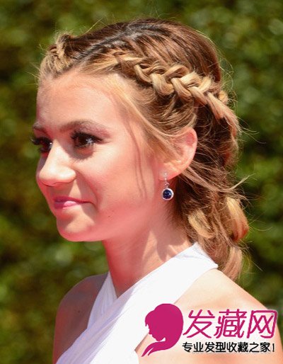 将头发偏分周分别将前额的头发向后变成略带松散的麻花辫,并延头的两侧扎至脑后。这样的发型特别适合头型不够立体,或者三角头型的人,可以增加头定的宽度修饰脸型。