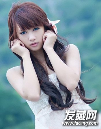 波浪卷的长发自然的垂在胸前,清新唯美,厚重的齐刘海设计,凸显出mm精致小巧的五官,甜美感十足。