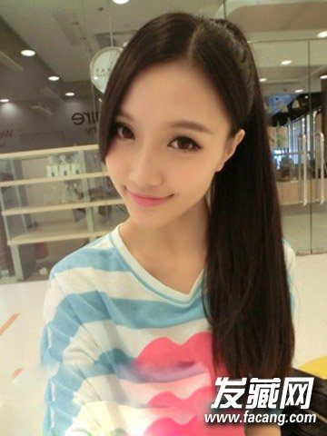 长直发发型不仅显嫩,如何怎么搭配都适合,扎起利落的高马尾,四刘海的刘海来修饰不太完美的脸大,青春率真。