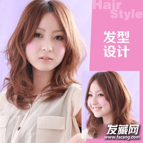 棕色染发衬托白皙肤色,适合的中分让脸颊立即小巧,特别是在颧骨开始的卷发弧度,让脸型显得更小巧与可爱。