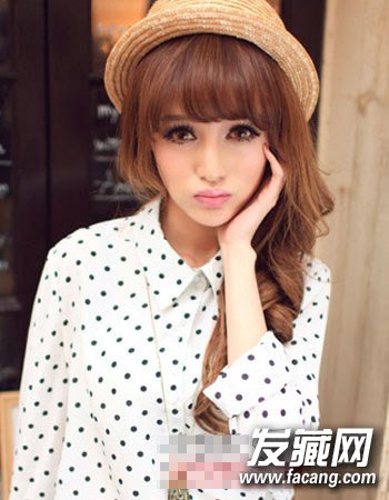 厚重的齐刘海造型设计可是最显女生的可爱甜美风的了,而配合这种时尚的棕色染发与简单的侧边蓬松辫子扎发造型更添清新甜美田园风。