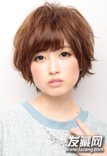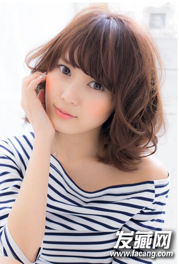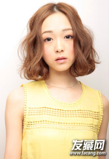 中分的长刘海露出饱满的额头,令看上去脸型变得修长,瞬间瘦脸,搭配蓬松的蛋卷烫短发,显得相当的甜美可人,板栗色的发色令皮肤看起来更加白皙。