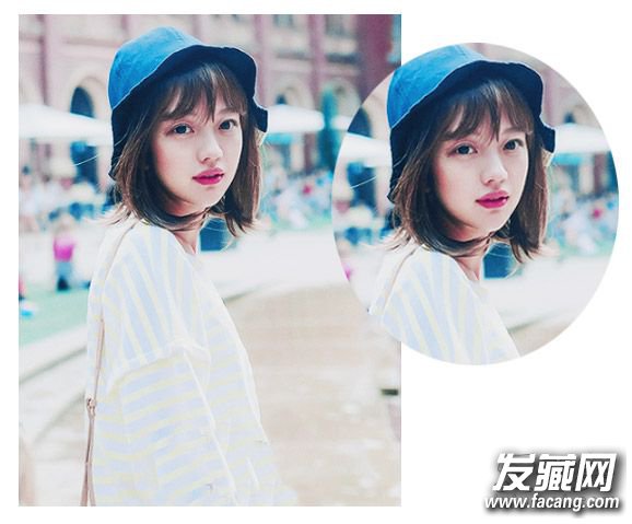 哦,简约气质的中短发与薄平刘海搭配起来,戴上帽子十足的休闲风。