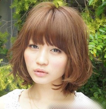 厚厚的刘海覆盖住眉毛,使得桃花型眼睛更加的具有魅惑感,两侧内卷发丝起到缩小脸型的效果,是非常值得推荐的小脸发型呢!