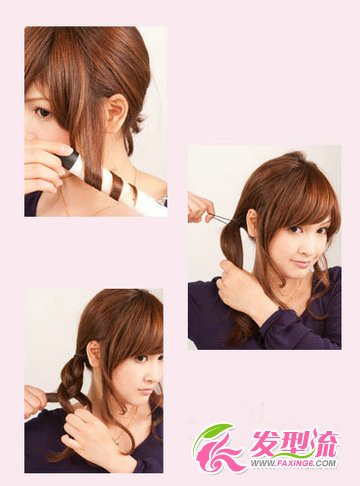 上预留刘海处及两颊旁发梢(大约在头发前部约三分之一的地方),利用卷发棒卷出造型感。