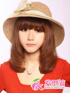 与第二款发型看似相同,只是在层次上做了些许变化。厚重的刘海增加了造型的可爱度,下面发量做出空气感,让发型看起来较为轻盈。恰到好处的中长发露出颈部线条,带出些些诱惑力。一顶草帽的搭配,突显田园风。