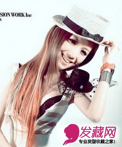 ,整款发型经过浅栗色发色的漂染加上橘黄色韵染,时尚个性的染发,再加上日式小礼帽的搭配萌范十足。