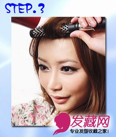 用吹风机加强刘海的弧度效果。接着用猪鬃毛梳子将头发吹顺,这里有一点小窍门,首先用中度的热风吹,吹整的时候尽量利用猪鬃毛梳子的抓力,将头发向内屈曲着吹,而不要用吹直发的方法使劲把头发下拉。这样出来头发会蓬一点。