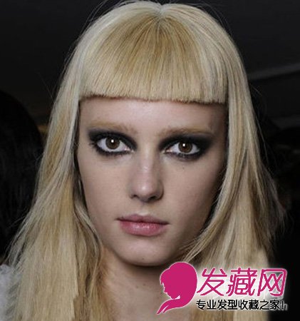 金黄色的飘逸长发与纤薄的齐刘海结合,塑造了另类层次感。黑色的烟熏妆容突显女强人的霸气,再加上平直刘海与眉眼之间形成的平行线,个性时髦,缔造了锅盖头的“强悍”之美。