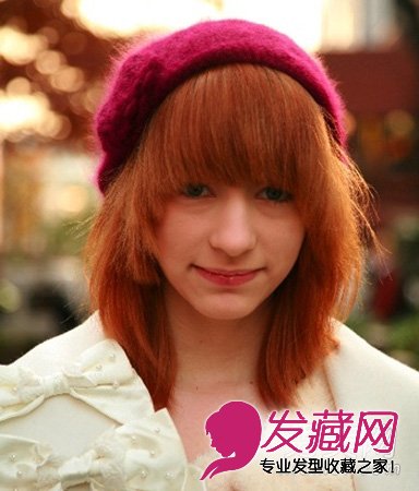 浅橙发色,超长的齐刘海半遮住双眼,多层次略微凌乱的蓬松短发可以适当的修饰脸型,搭配上紫色兔毛毛线帽,温柔可爱。