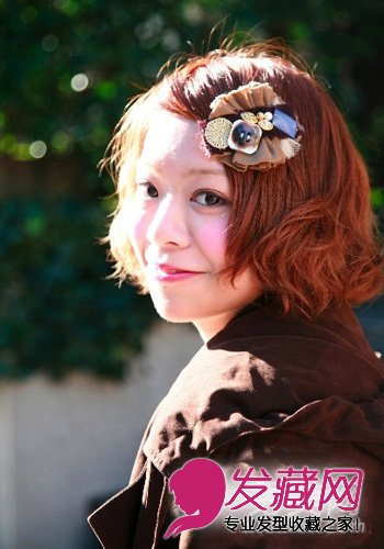短发,凌乱微卷度,手工的古董发饰元素丰富,色调搭配发色和服饰的颜色,侧别住刘海,发饰绝对是加分点,让平淡的
