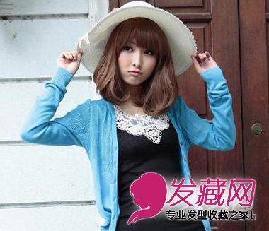 发量略显重的齐肩梨花头发型将脸型衬托的非常小,齐刘海又可以修饰眼睛,发型与帽子和服装都很好搭配。