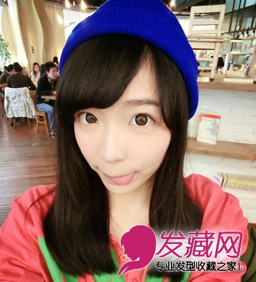 童颜少女精灵的眼睛吐舌的表情,非常的显调皮可爱,简易的中长直发梨花头,加蓝色系贝雷帽搭配更俏皮惹人爱。