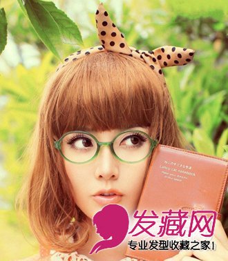 金棕色梨花头,加染上金棕色的染发颜色,十分的流行抢眼,还衬托出了女生更加白皙的肌肤,厚重感齐刘海的发型设计结合内扣的发尾,立即呈现出一个小脸美女造型,头顶蝴蝶结发箍的点缀,更显甜美气息。