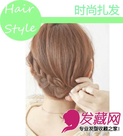 然后将麻花辫与其他的长发全部弄在一侧,用发圈扎起。