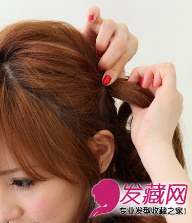 step2:沿着耳朵上方取出头顶上部分头发,绑成侧边马尾。