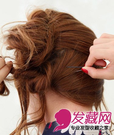 step6:再将剩下的头发全部拉扯至左侧耳朵附近,扭转成图中造型后也用U型发夹固定。