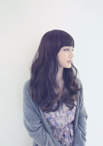 棕色偏红的染发颜色,在一年四季都比较热门。齐刘海没有刻意的追求流畅的线条,而是在眼帘上方带点柔和的自然弯曲,更随意自然。发尾随意的纹理和女生sexy的妆容搭配堪称一绝,回头率200%。