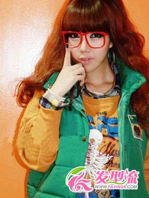 齐刘海的长卷发搭配一头棕色染发,看上去是不是潮范儿十足呢?小编觉得这款平刘海非常适合长脸女生来打造,平整的刘海覆盖住额头,打造出来的卷发很好的修饰了额头两侧,搭配红色无框眼镜和鲜艳的服饰,很有格调哦。