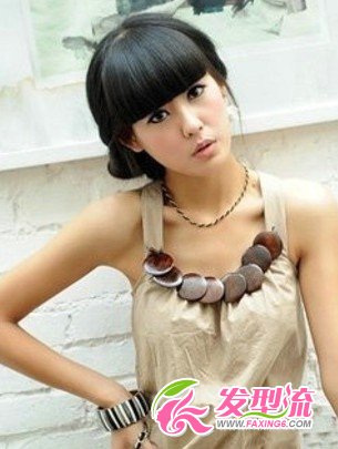 一丝不乱,干净的平刘海好像有着BOBO头的流畅感和柔顺的质感!将长长得盘发盘在脑后,看上去非常的有立体感的一款女士盘发造型,将优雅与可爱相融合,擦出另外一种迷人的火花,黑色是你不错的选择哦!