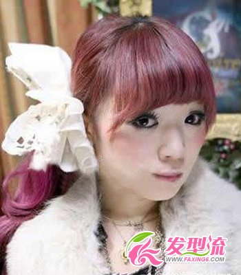一款非常时尚靓丽的齐刘海发型,绝对算得上是一款名副其实的洛丽塔发型。齐刘海制造出蓬松内卷效果,更显青春和可爱,略过眉的刘海打造出大眼小脸的效果。波浪式卷发扎出侧马尾,显得十分俏皮活泼。染上红棕色的发色,前卫时尚,绝对是人群中的亮点哦!