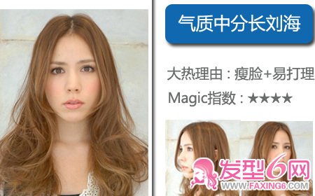 小刘海大Magic长卷发永远是女生的梦幻发型,不仅让女生羡慕,更让男生心动。中分刘海似乎永远不会退出时尚舞台,很多国内外的model都是它的粉丝。它的奇妙之处在于能够利用脸颊两侧的长刘海有效遮盖脸颊的肉肉和两边轮廓,达到绝佳的瘦脸效果,让你的五官看上去更加精致突出,所以你的扁塌鼻子也在瞬间高挺了不少哦!