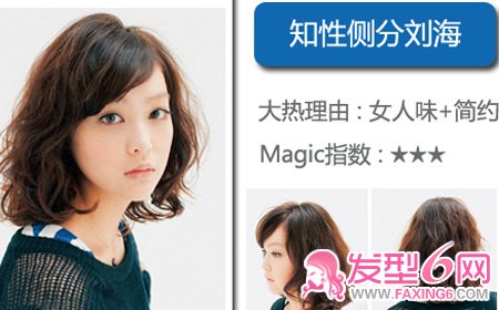 小刘海大Magic将长刘海自然侧分能极好地拉长脸型,没有娃娃头的厚重感,又不失知性飘逸的感觉。将刘海修剪成轻薄型,否则偏分的头发会堆积出臃肿感。还有要注意的是,侧分刘海不可以使头上的发流分界,刘海在额头上稍稍分出夹角即可。简约的刘海率性地把五官露出,这样的自信恰恰会起到魔法般的效果,五官就这样成为重点!