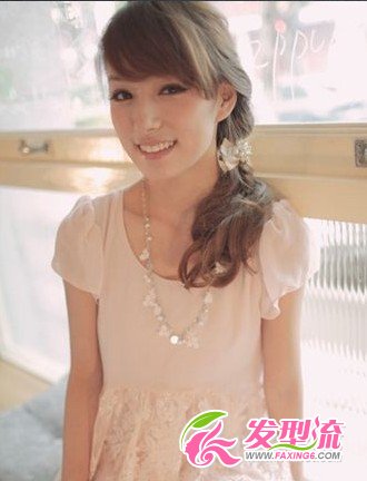 厚重的斜分刘海发型,随意散落在额头上,搭配侧编斜束发,突显出邻家女孩的感觉。