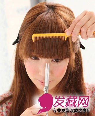 等刘海长度都修剪好以后,可以通过梳子来检查一下刘海的均衡程度。在那些头发比较厚重的地方,只需将剪刀稍微斜着伸到刘海当中打出轻薄的感觉即可。如果将已经修剪好的发线稍微剪碎一下的话,即可修剪出弯曲自然的刘海来。