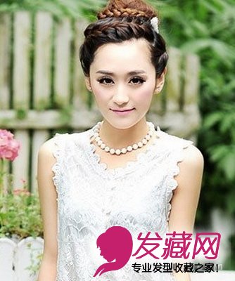 在刘海部位编制一股横向的麻花辫发,特别的发辫方向塑造了女生发型的别致效果,头后部的高位盘发发髻,同样运用麻花辫的元素,增加发型的独特的美丽。