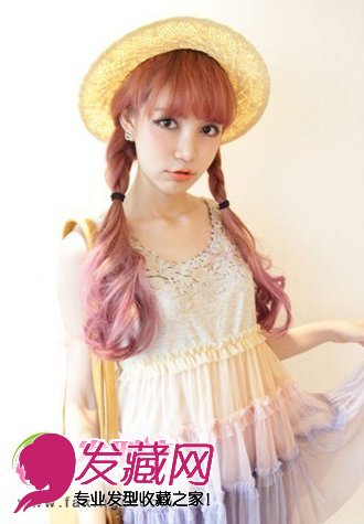 ,显得无比的俏皮可爱,红色与棕色挑染的染发发色,令发型十分的富有时髦洋气感,搭配一顶编织草帽,出门游玩最好的搭配。