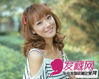 烫成大卷随意披散在肩上,显得比较优雅淑女,薄薄的齐刘海给人清爽清新的感觉,也有着很好的减龄功效,两侧别上粉红色蝴蝶结发卡,尽显浪漫甜美气息。