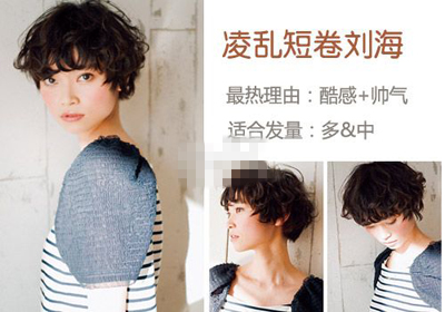 推荐理由:如果是短发 的MM,或者走个性路线的美眉们,可以尝试利用卷发 刘海创造小脸的效果。利用卷发棒,将头上的发束做出蓬松感和凌乱感,瞬间头发的整体体积变大,相对于路出的脸蛋就变得更小,瞬间达到小脸的效果。因为凌乱的发流更加引人注目,很容易将人的视线转移到发流的艺术感上,而忽略了脸型大小比较的事上。忘却了大小脸的不同,哪里还有大小脸的分别呢?!