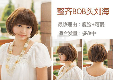 推荐理由:每位MM的发型是不是都留着刘海呢,你都只把它往旁边带吗?现在更好地利用你的刘海,让你瞬间小脸吧。根据脸型修剪出适当的弧度的齐刘海,运用刘海遮住额头,有效地将额头和脸蛋的比例打破,能够更好地达到小脸的效果。记住最佳的刘海长度,是在眉毛下,睫毛上哦。整理刘海的时候,运用卷发 棒将刘海做成微“C”的蓬度,能够突出额头,营造明显五官的效果。