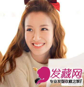 自然披肩,额前的刘海全部翻转到脑后用一个大大的红色蝴蝶结发卡固定住,形成一个蓬松的弧度同时也给人脸拉长的视觉效果,发型简单却又别致优雅。