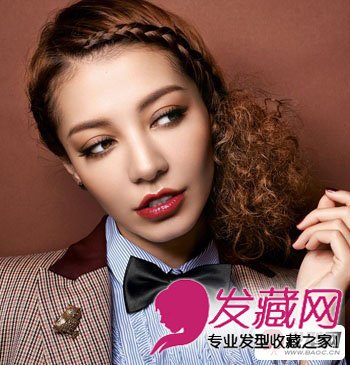 简单的复古刘海编发发型,三七分的刘海沿着发际线编成麻花辫侧扎在耳边,古典优雅,耳侧斜扎的卷发打造的非常蓬松,英伦风十足。