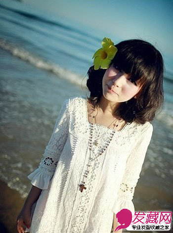 整个造型给人一种小清新的感觉,非常纯真浪漫。经典的黑色发丝在阳光的照射下显得柔亮有光泽,精致的小卷发妩媚甜美,非常有动感,尽显小女生的青春活力。