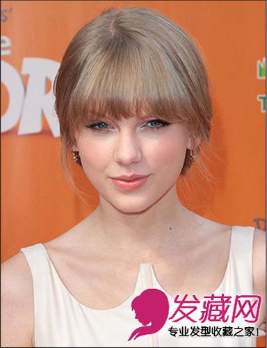 这种刘海适合搭配任何一种发髻,泰勒.斯威夫特以这款齐刘海低垂发髻造型出席电影的首映式。它能很好平衡纯真年轻与优雅淑女的 感觉,长刘海也适合任意年龄的女性。