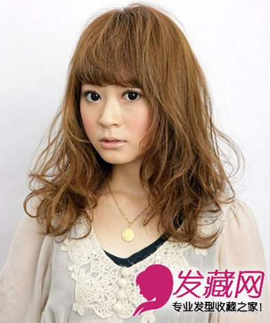 编辑点评:微微内卷的齐刘海多了几分可爱,蓬松柔软的发尾营造出流动的空气感,整个齐刘海卷发显得甜美清逸。