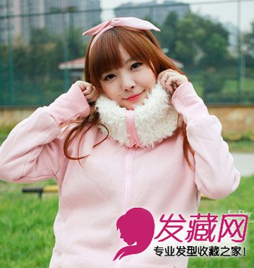 棕色的染发很衬白皙的肤色,系上蝴蝶结发带,粉嫩感与外套如此相称,甜美可爱。