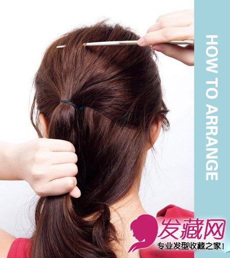 step1:将头发半扎后用密齿梳的尾部轻轻将头顶的头发挑出蓬松的纹理