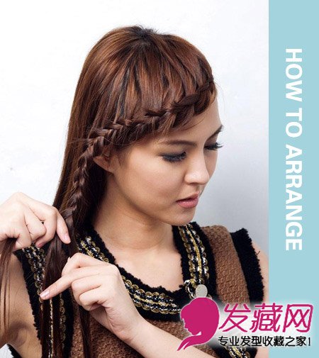step1:将长刘海从左向右编成精致的三股辫,一直编到发尾处。