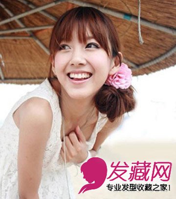 适合圆脸女生的一款简单扎发,长发在侧边扎低发髻造型,稀疏的齐刘海修颜透气,搭配花朵点缀在鬓间,唯美浪漫。