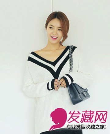 同样是低扎的马尾,斜刘海沿着眼角垂直下来,两者的搭配看起来很有韩范,棕色的染发给整个造型平添了不少的时尚感,斜刘海可谓是这款发型的最佳选择。